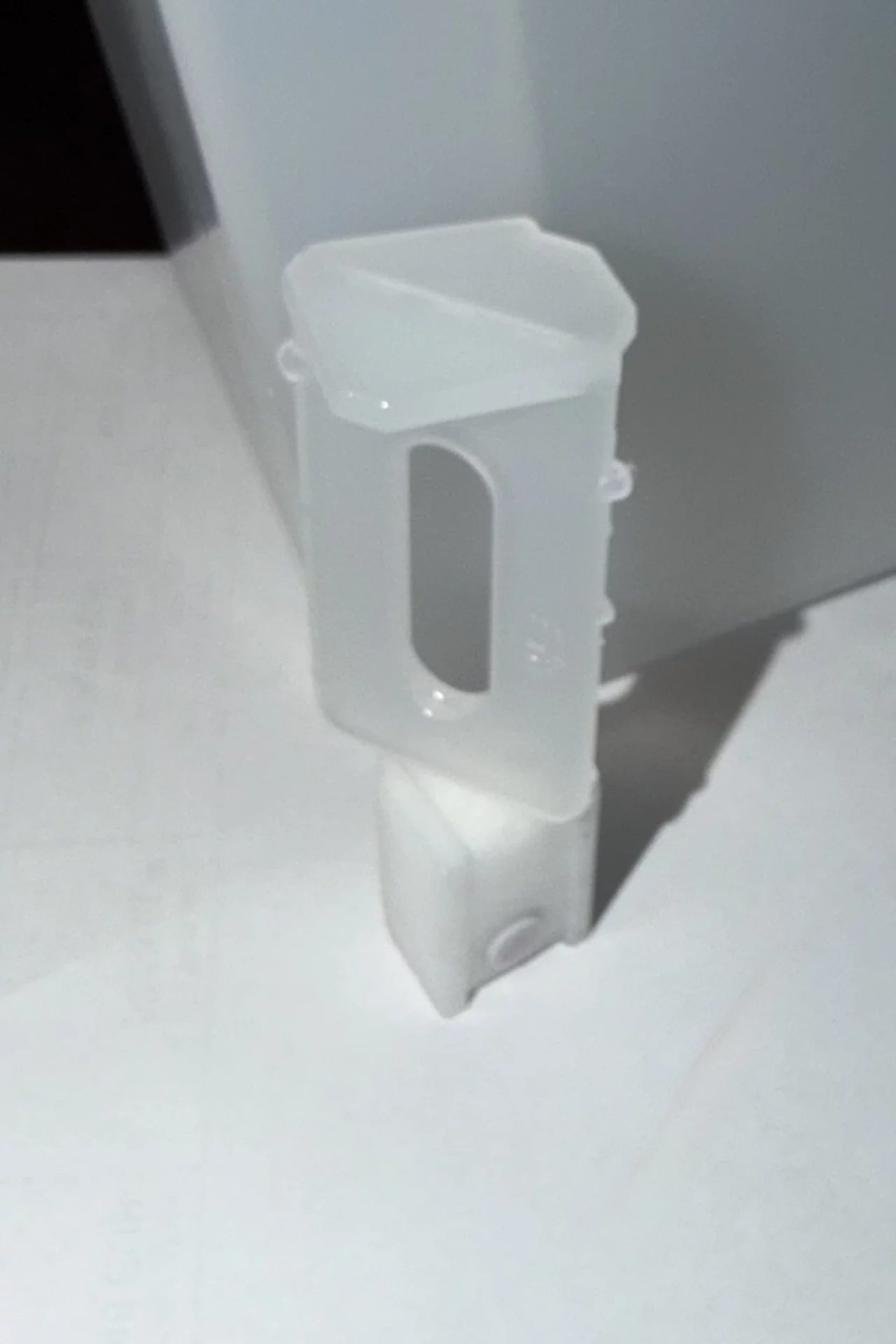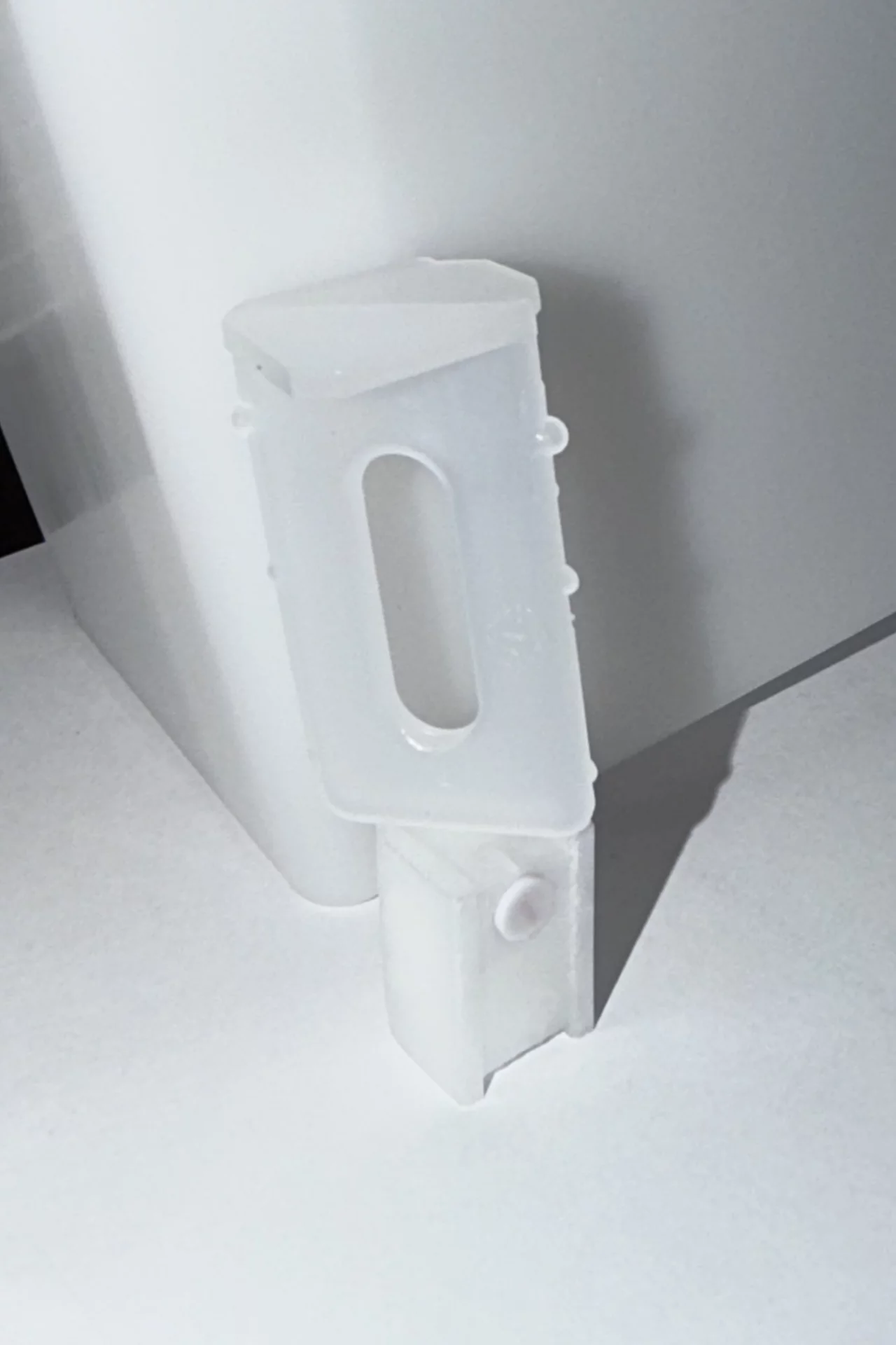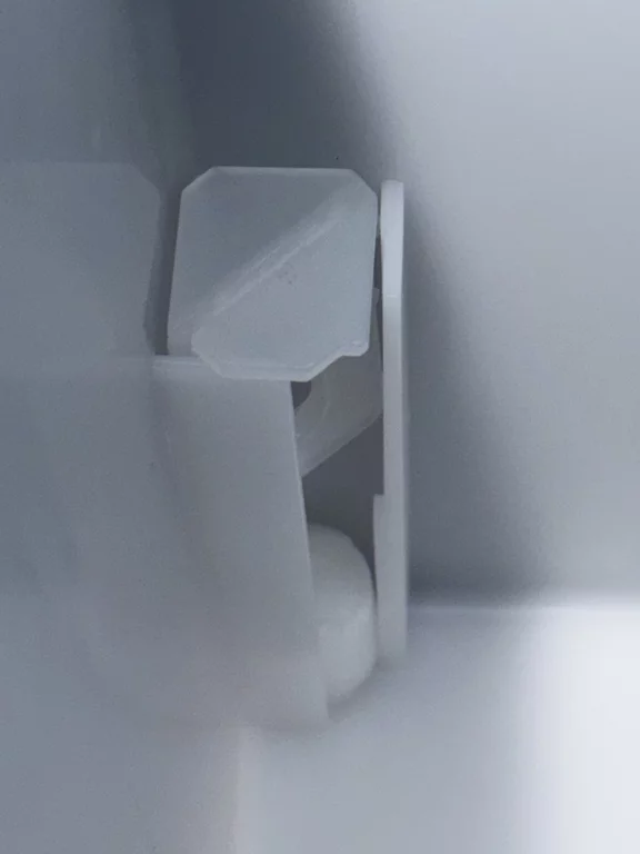 Anschließend den Stopper, das Plastik T-Stück, einsetzen, sodass die Ausbuchtung auf der Oberseite nach rechts auf dem ersten Bild zeigt, bzw in Richtung der gegenüberliegenden kurzen Seitenwand.