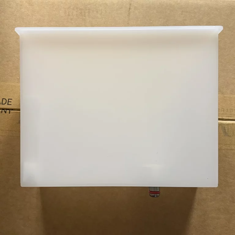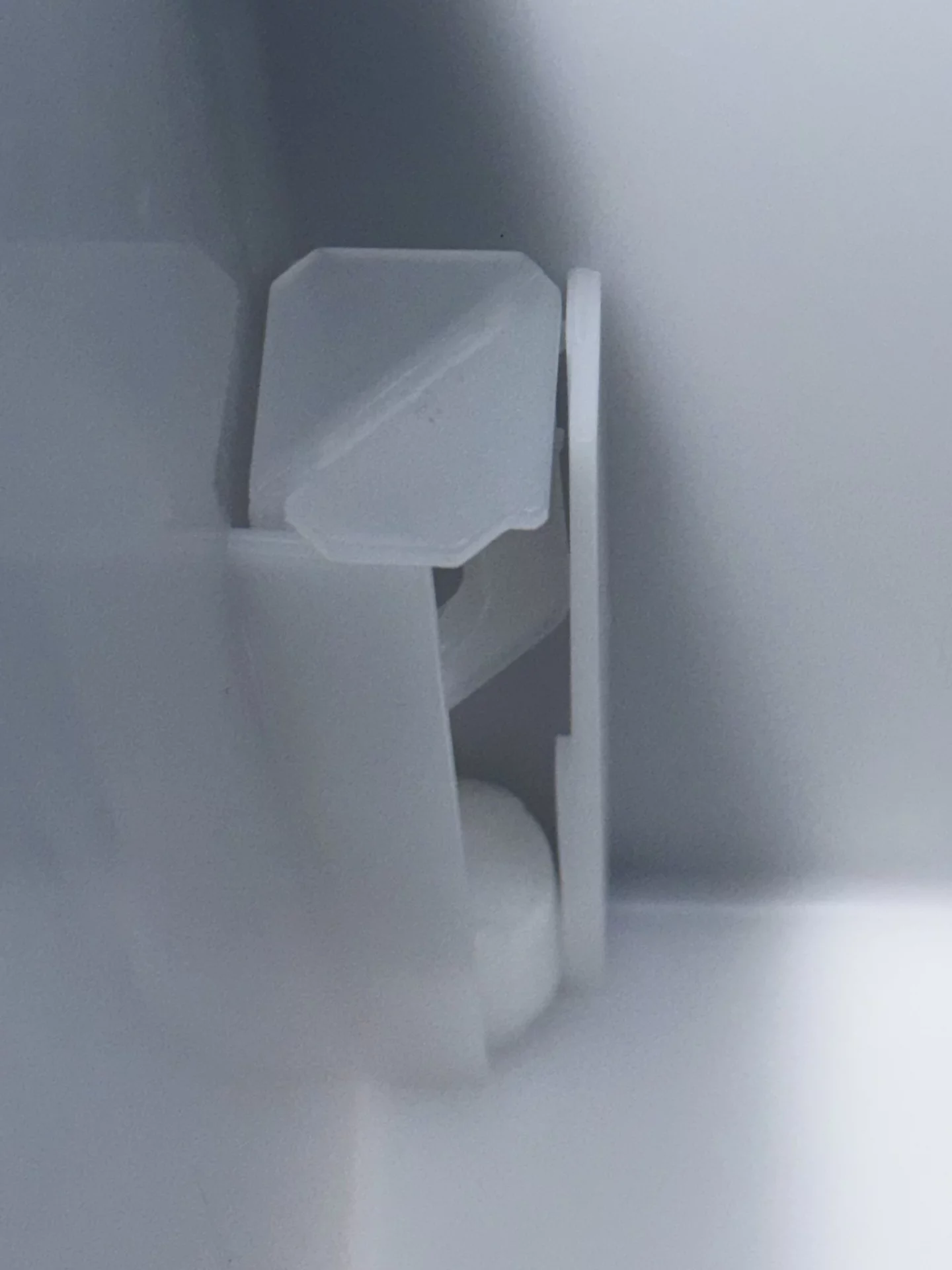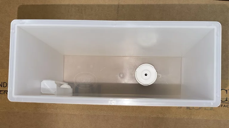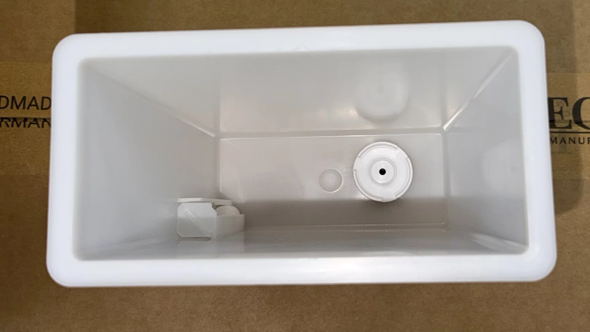 Bei dem breiten Wassertank wird zuerst der Schwimmer mit dem kleinen Magneten an der langen flachen Seite in den Tank eingesetzt. Der Schwimmer muss so eingesetzt werden, dass die flache Seite nach unten zeigt auf dem ersten Bild. Außerdem muss bei dem breiten Tank der Magnet ( klein, rund im Schwimmer) nach unten ausgerichtet ist.